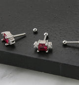 Barbell with a square dark pink cubic zirconia gem on the end with two clear cz gems on each side. Made from 316L stainless steel and externally threaded. Gorgeous option for cartilage or tragus piercings! Size is 16G with a bar length of 1/4" (6mm). Ball size is 2.5mm. Sold individually. For healed piercings.
