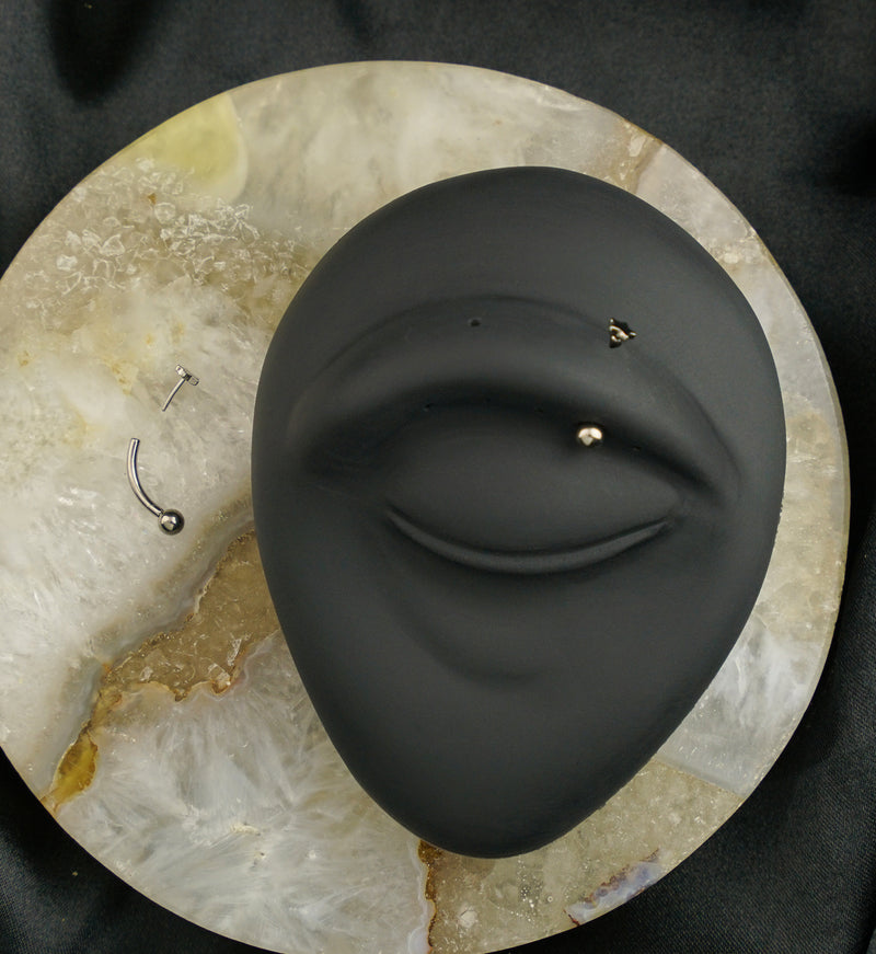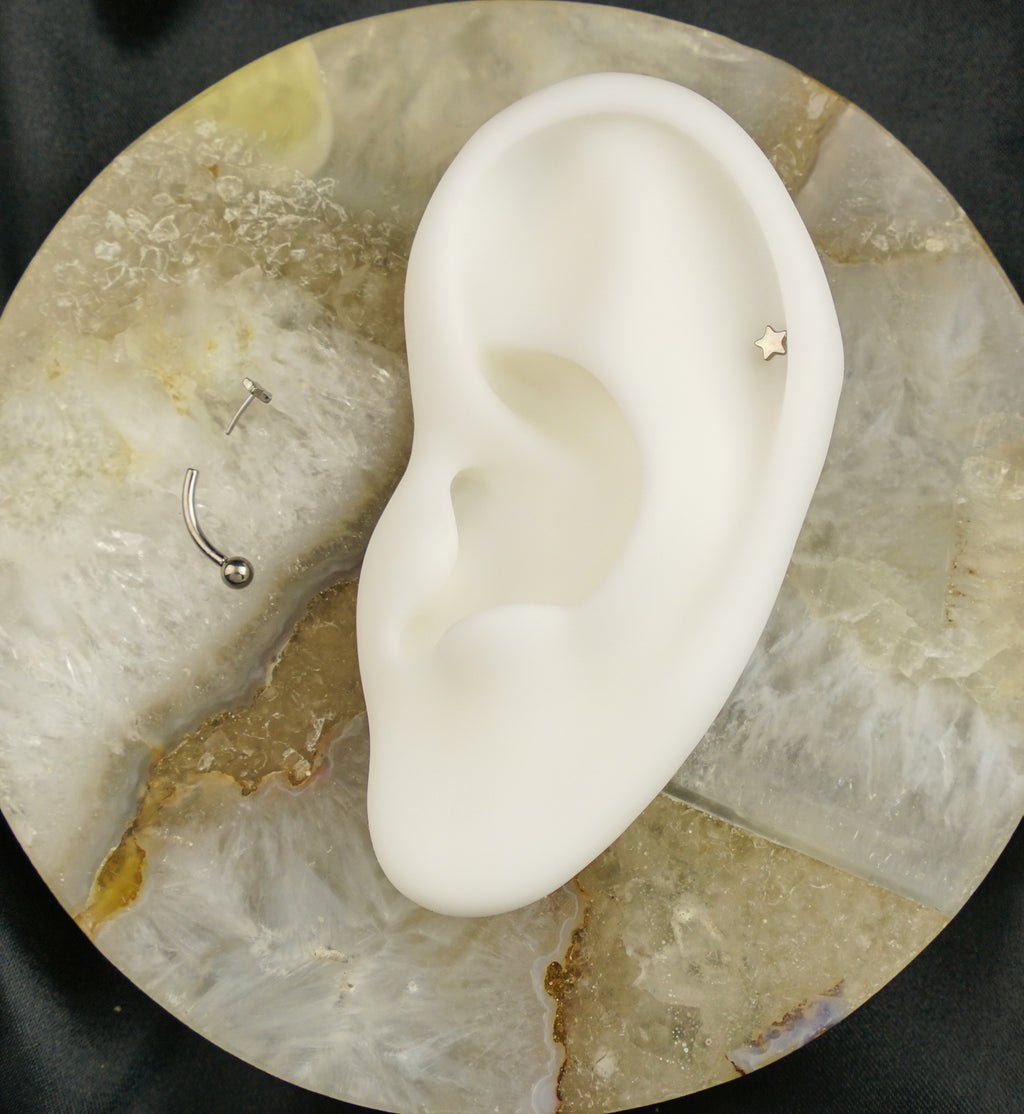 Curved barbells decorated with a mini, star design on top. The top piece has a threadless design that makes it easy to put in and take out. The top design measures 3mm. Made from durable ASTM F-136 titanium with an inner length of 5/16" (8mm) and a 16G size. Complete with a 3mm ball on the end. Sold individually. Fun jewelry choice for eyebrow or rook piercings!
