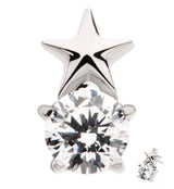 Threadless top piece that has a prong set 4mm clear cz gem topped with a star. Made from ASTM F-136 titanium. Measures about 6.9mm x 4mm. 25G pin. Fits most threadless posts. Sold individually (top piece only).