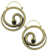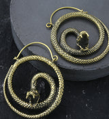 Yellow brass earrings/hangers with coiled up snake about to strike design. Size is 18G. Measures at 45mm x 45mm. Weight is about 18.5 grams each. Made from brass. Not meant for long term wear. May oxidize under extreme moisture conditions. Sold in pairs (2pc). For healed piercings/lobes.