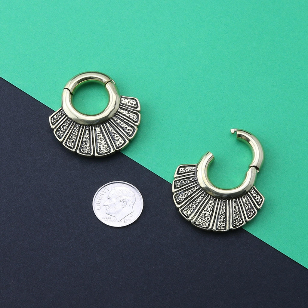 Sold in pairs (2pc). Size: 4G and bigger to wear. Size: 35mm x 32mm. 20 grams each. Brass is not meant for long term wear. May oxidize under extreme moisture conditions. For healed piercings.