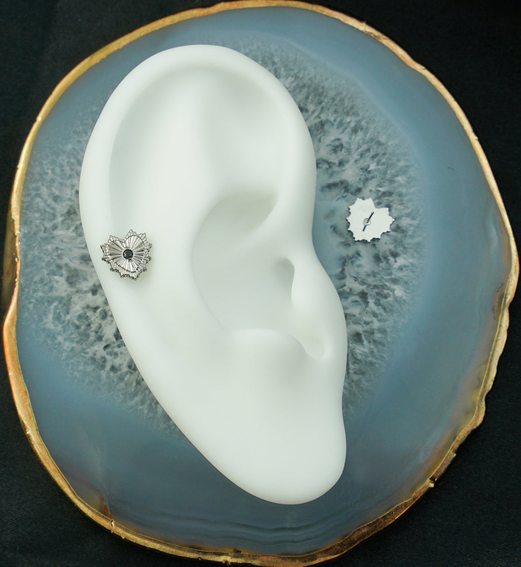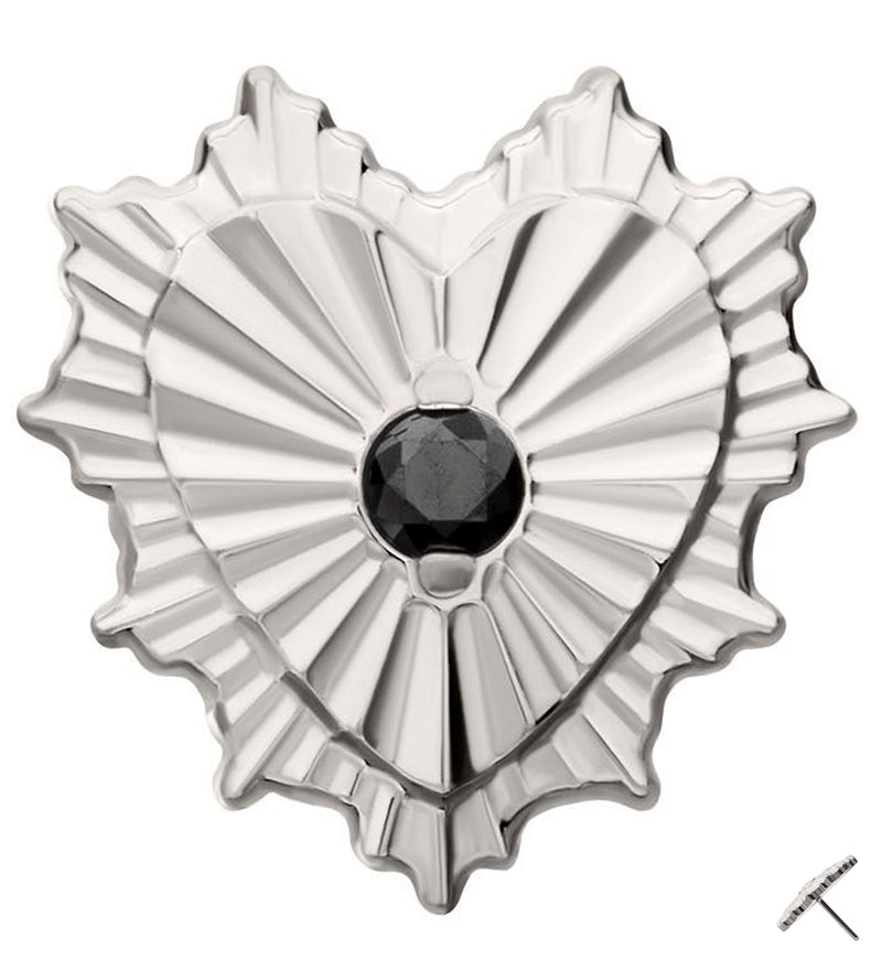 Made with strong ASTM F-136 titanium, this threadless top piece has a heart design that has a sunburst, corrugated design with a 2mm, centered, black cz gem. The design measures about 8mm x 8mm. This top has a threadless design and fits most threadless posts. Sold individually (top only).