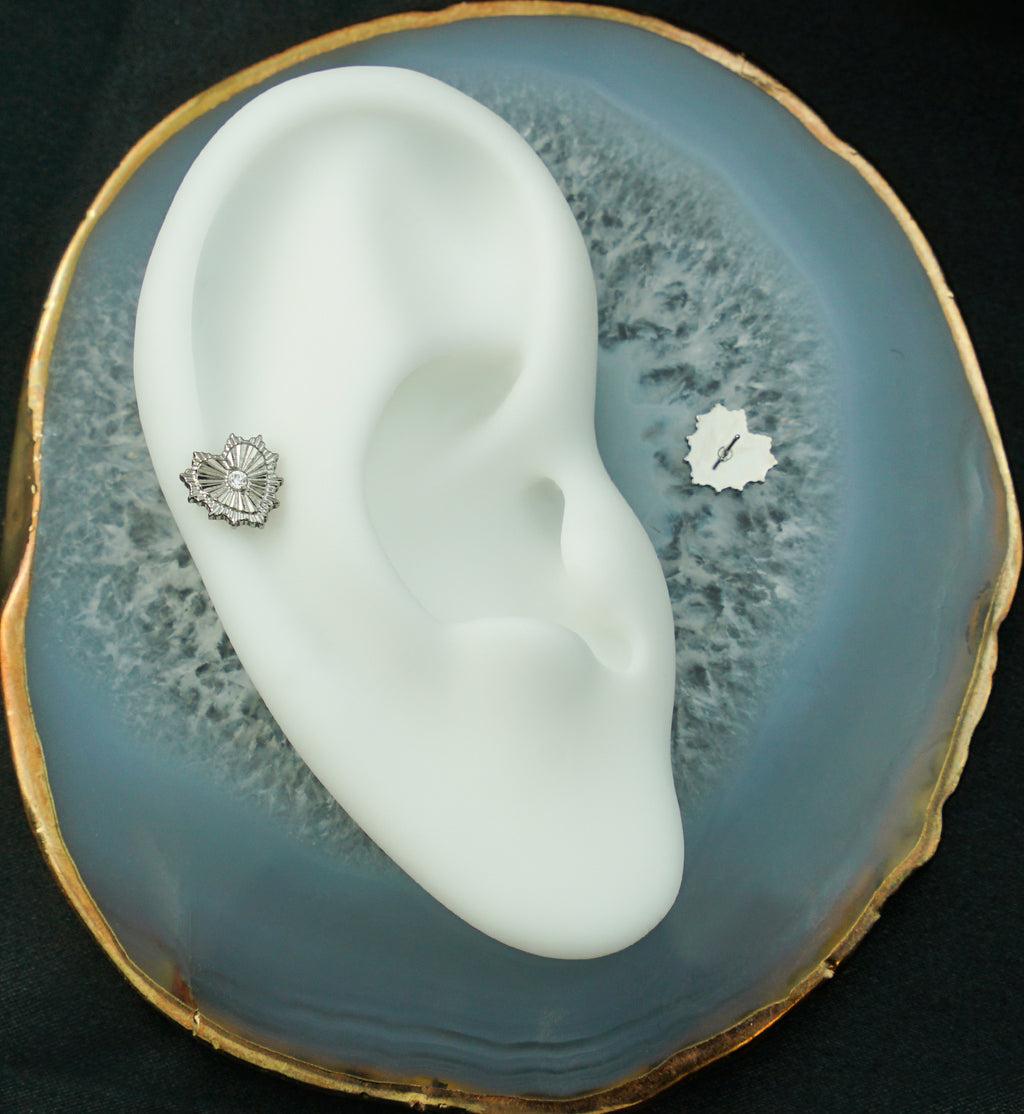 Made with durable ASTM F-136 titanium, this threadless top piece has a heart design that has a sunburst, corrugated design with a 2mm, centered, clear cz gem. The design measures 8mm x 8mm. This top has a threadless design and fits most threadless posts. Sold individually.
