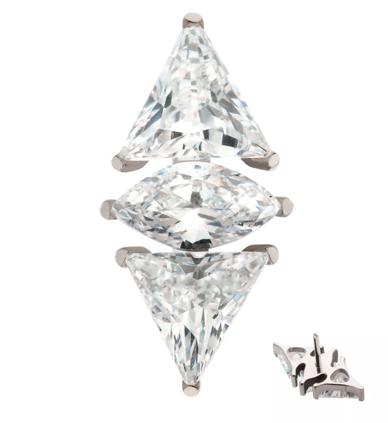 Threadless top piece that has two triangle shaped clear cz gems on either side of an oval clear cz gem. The gems are barely separated from each other creating a cool dissected look. Made from ASTM F-136 titanium. Measures about 9mm x 5mm. Fits most threadless posts. Sold individually (top piece only).