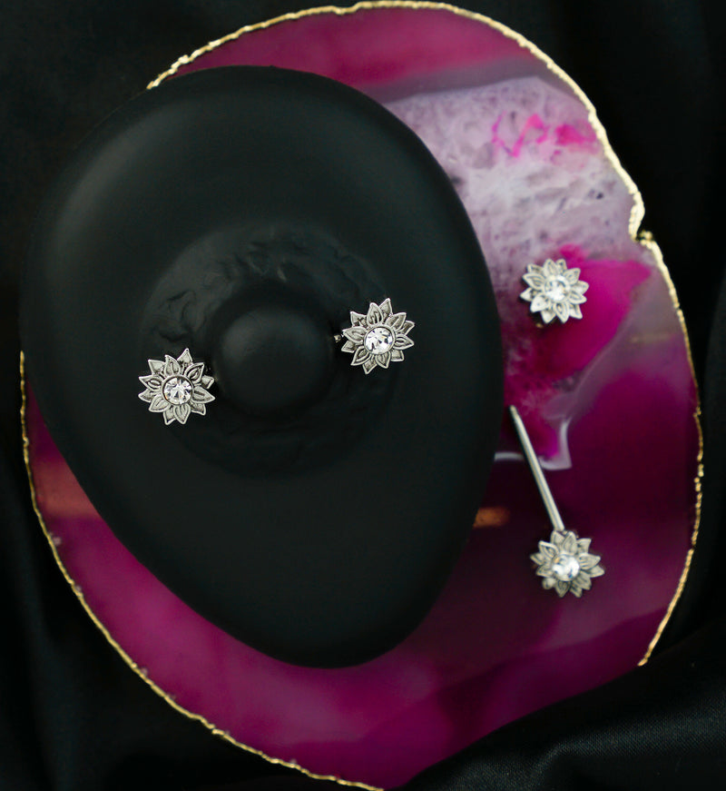 Pretty barbells that are made from 316L stainless steel with a sunflower on each end that has an etched detail and centered, clear cz gem. Each flower measures about 9mm and is externally threaded. Each barbell has a 9/16" (14mm) wearable area and is sized 14G. For healed piercings and sold in pairs.