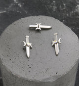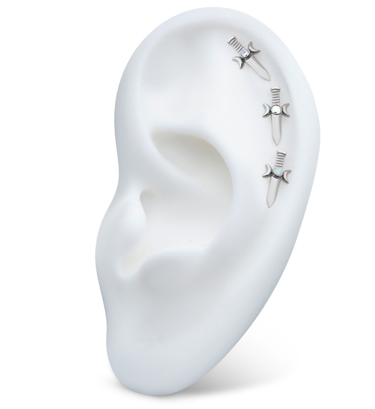 Internally threaded top piece that has a sword shape and moon phase with a 2.5mm, bezel-set, rainbow aurora cz gem accent. Made from durable ASTM F-136 titanium. Measures about 14.5mm x 6.15mm. Size is 16G with M0.9 threading. Sold individually (top piece only).
