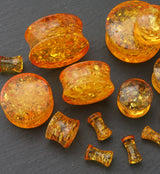 Warm colored, synthetic amber plugs that are filled with golden flakes that create a glittering effect. These plugs are acrylic and have double flares. Handmade and polished. Find your perfect size from the drop down menu! Available in sizes 6G (4mm) - 7/8" (22mm). Sold in pairs (2pcs).
