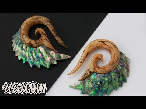Handmade from tamarind wood, these angel wing hangers feature carved abalone shells for a unique and natural design. Sold in pairs, they range in size from 8G (3.2mm) to 1/2" (12mm). Perfect for healed lobes, avoid contact with water to preserve the color and pattern variations of the wood and shell.