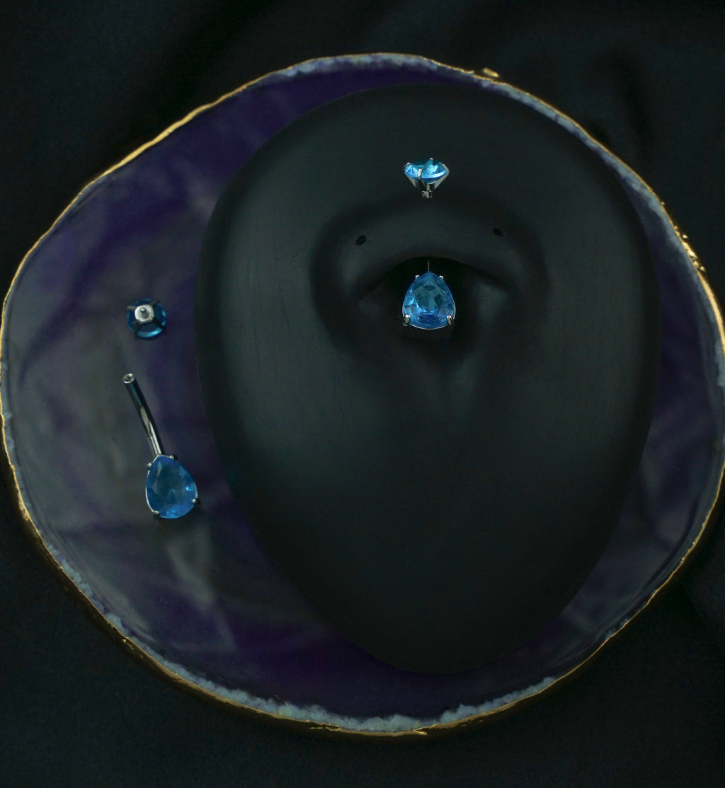 Shimmering teardrop belly button rings made with 316L stainless steel and featuring an internally threaded barbell. This 14G navel ring is sure to make a statement as it has stunning aqua CZ gems, measuring 5mm and 8mm x 6mm. Sold individually, this is a must-have for any belly piercing.