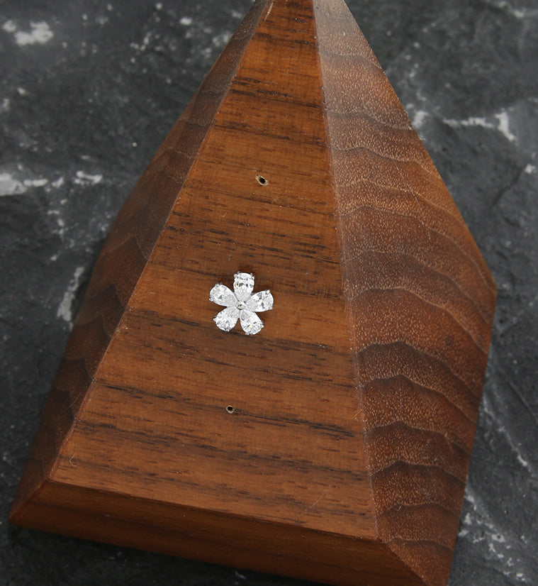 Threadless top piece that has a flower design made up of five teardrop clear cz gems. Made from ASTM F-136 titanium. Measures about 6.5mm x 6.5mm. 25G pin. Fits most threadless posts. Sold individually (top piece only).