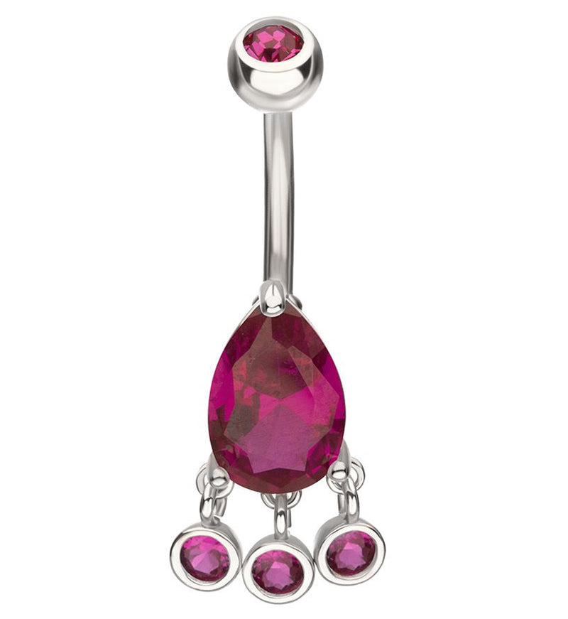 Beautiful belly button ring that has a teardrop fuchsia pink cz gem at the bottom with three, attached, bezel-set, fuchsia cz gems. On top, there is a bezel set, 5mm fuchsia cz gem. The belly ring has a wearable of 3/8" (10mm) and a size of 14G. The design measures 26mm x 10mm (including dangles) overall. It is created from 316L stainless steel and is externally threaded with M1.2 threading. Meant for healed piercings. Sold individually.