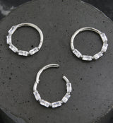 Hinged segment ring made from 316L stainless steel with a hoop design that has four baguette clear cz gems along the bottom. Size is 16G with an inner diameter size of 5/16" (8mm) or 3/8" (10mm). The hinged design makes this piece easy to insert and remove. Sold individually (1pc).