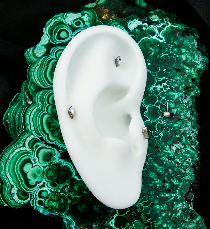 Threadless top piece that has a kite shaped rainbow aurora cz design with a long point. Made from ASTM F-136 titanium. Measures about 5mm x 3mm. 25G pin. Fits most threadless posts. Sold individually (top piece only). A fun way to jazz up your look.