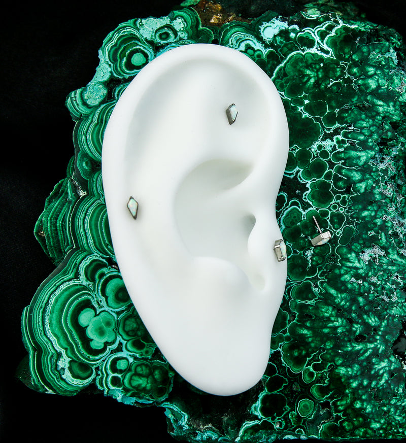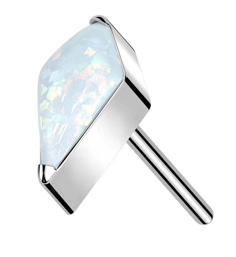 This Tetra threadless top piece makes the versatile piece to add to your collection. It has a synthetic white opalite on a kite like design. Made from durable ASTM F-136 titanium. Fits most threadless posts. Measures about 5mm x 3mm. 25G titanium pin. Sold individually (top piece).