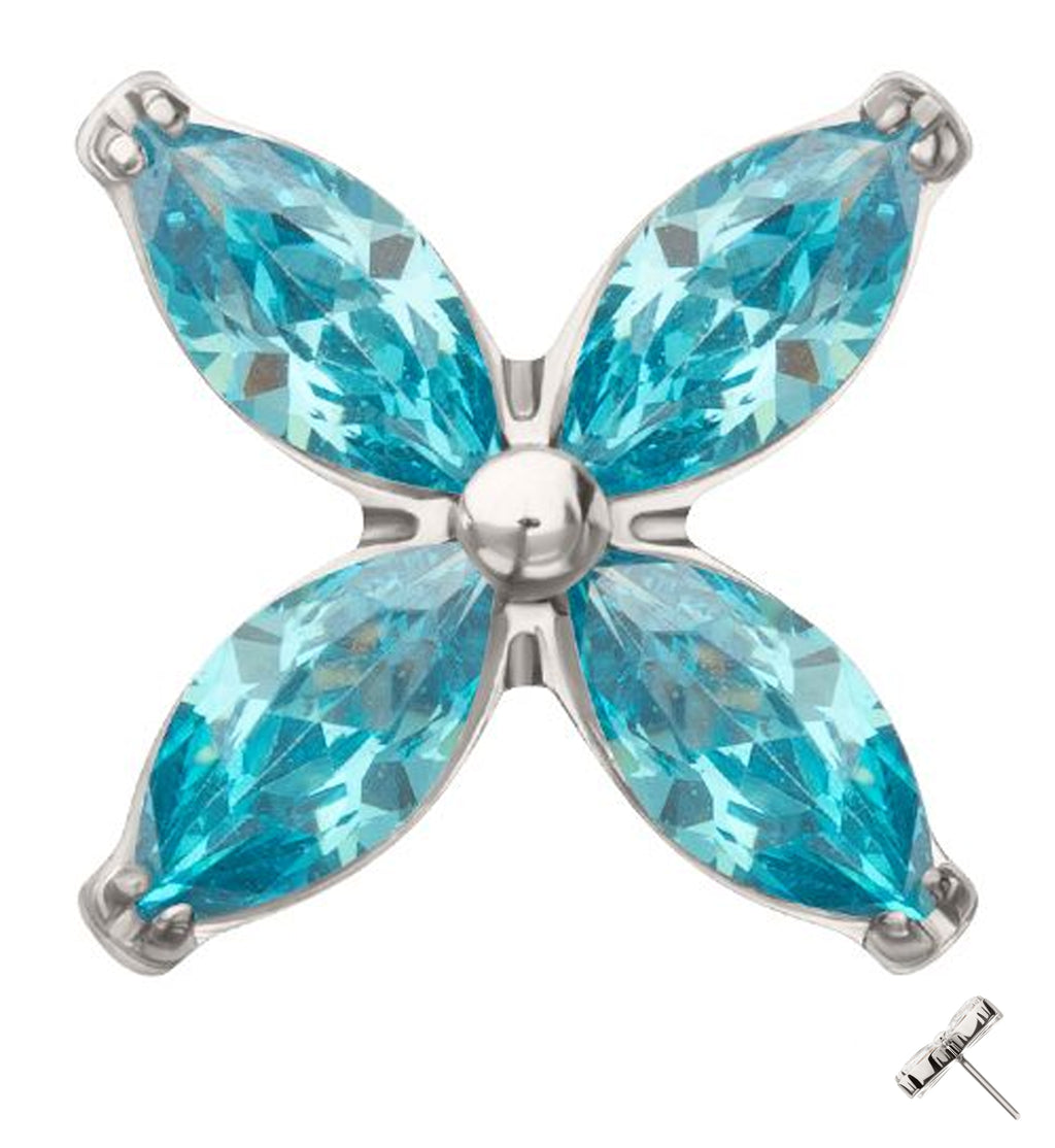 This threadless top piece has four, marquise, blue topaz cubic zirconia gems on top made a four petal look. Pin size is 25G so it fits most threadless tops. The top size is about 7mm. It is made from ASTM F-136 titanium. Easy to insert and take out. Sold Individually - top only.