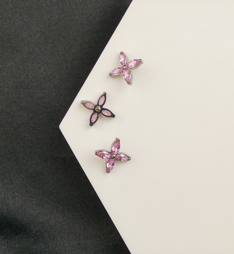 This internally threaded top piece has four, marquise, light pink cz gems on top that create a four petal flower look. Size is 16G so it will fit on both 16G and larger size labrets. The top size is about 7mm. It is made from ASTM F-136 titanium. Sold Individually - top only.