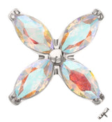 This colorful, internally threaded top piece has four, marquise, rainbow aurora cz gems on top that create a four petal flower appearance. Size is 16G so it will fit on both 16G and 14G size labrets. The top size is about 7mm. It is made from durable ASTM F-136 titanium. Sold Individually - top only.