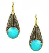 Made from golden brass, these dangling earrings are size 14G (1.6mm) so must be 14G or bigger to wear. They have a teardrop shape that has a speckled texture and a round, stone inlay that displays a pretty, amazonite stone. Brass is not meant for long term wear, it may oxidize under extreme moisture conditions. Length measures at 60mm and the width measures at 20mm. These weigh about 10 grams each. For healed lobes. Sold in pairs.