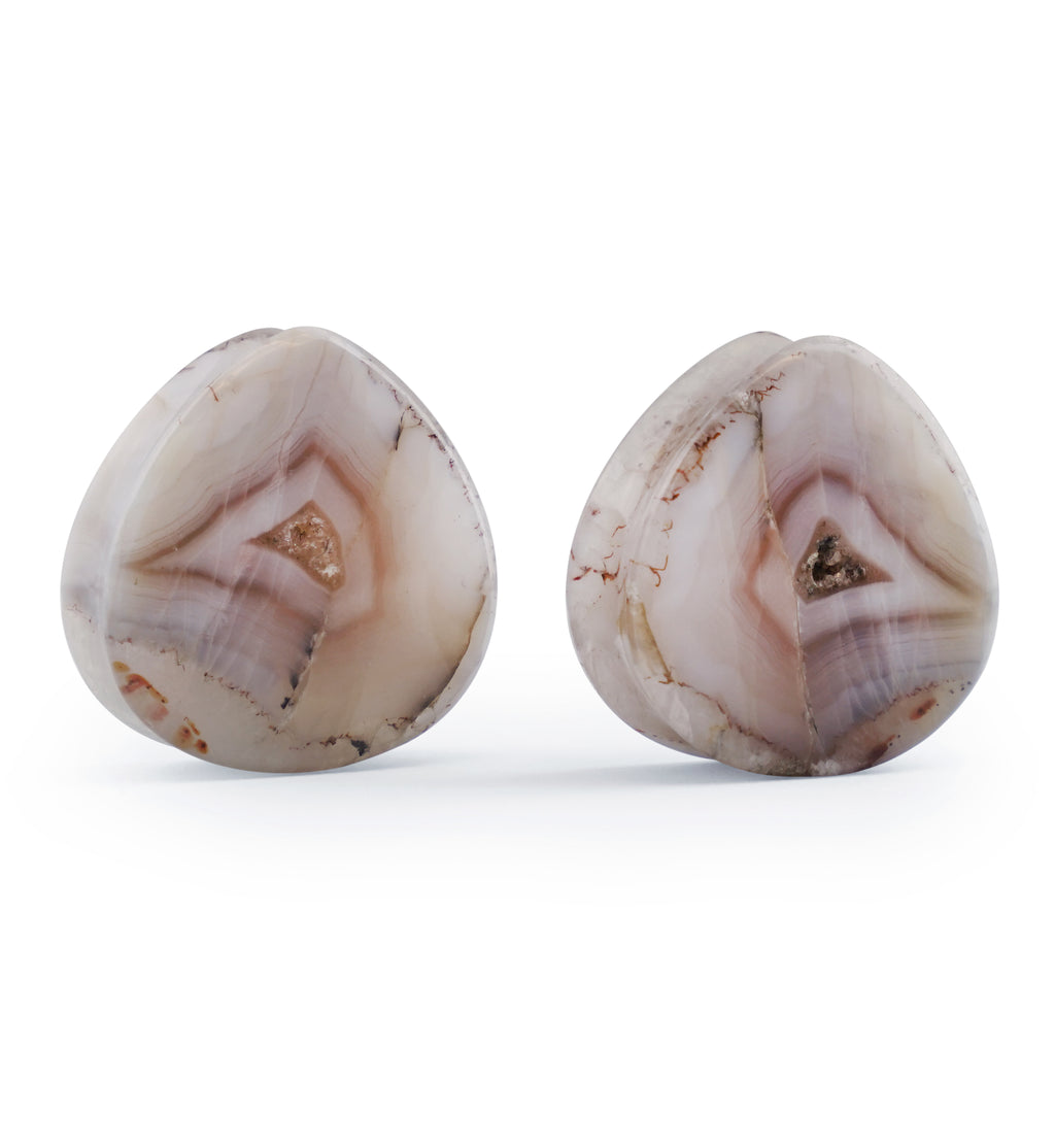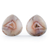 Gorgeous timor agate stone teardrop plugs with a natural design that has a mini geode in the center. Each pair of these double flare plugs is one of a kind in color and pattern. These plugs are smooth, polished and have a natural, white and grey design due to the nature of the agate stone. With a 1" (25mm) size and a wearable area of 14mm - 15mm, these plugs are meant for healed lobes. Sold in pairs (2pcs). Handle with care - fragile.