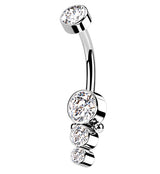 Classic silver colored belly button ring with 3 sequenced cz gems and one cz gem on top. Made with 316L stainless steel. Barbell is 14G with a 3/8" (10mm) length. Internally threaded. For healed piercings.