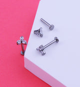 This titanium labret features a triple clear cz design on top. The ASTM F-136 titanium is internally threaded for a secure fit and comes in a size 16G with a 5/16" (8mm) length. The top design measures about 5mm x 5mm x 5mm. The flat disk backing measures 3mm. Sold individually (2pcs - top and bottom).