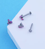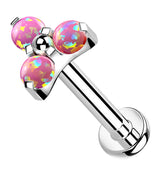 This shining titanium labret features a triple, synthetic pink opal gem design on top. The ASTM F-136 titanium is internally threaded for a secure fit and comes in 16G with a 5/16" (8mm) length. The top design measures 5mm x 5mm x 5mm with a flat disk back measures 3mm. Sold individually (2pcs - top and bottom).