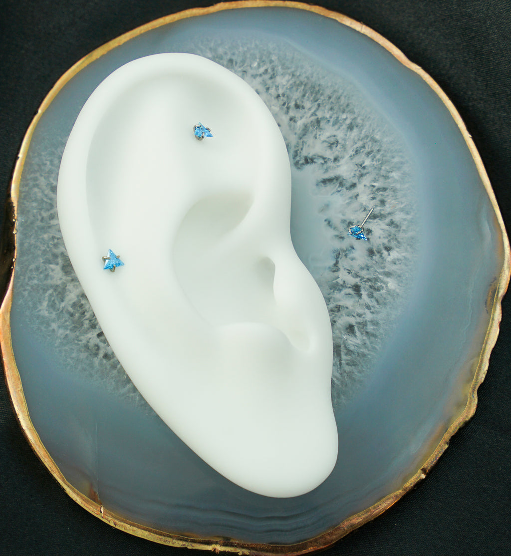 Made from ASTM F-136 titanium, this threadless top piece has a triangle, aqua cubic zirconia gem in a prong setting on top. Gem size measures 3mm. This top has a threadless design and fits most threadless posts. Sold individually (1pc).