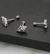 Barbell with a triangle shaped design on the end with a cut out and clear cz gem. Made from 316L stainless steel and externally threaded. Fun option for cartilage or tragus piercings! Size is 16G with a bar length of 1/4" (6mm). Ball size is 2.5mm. Sold individually. For healed piercings.
