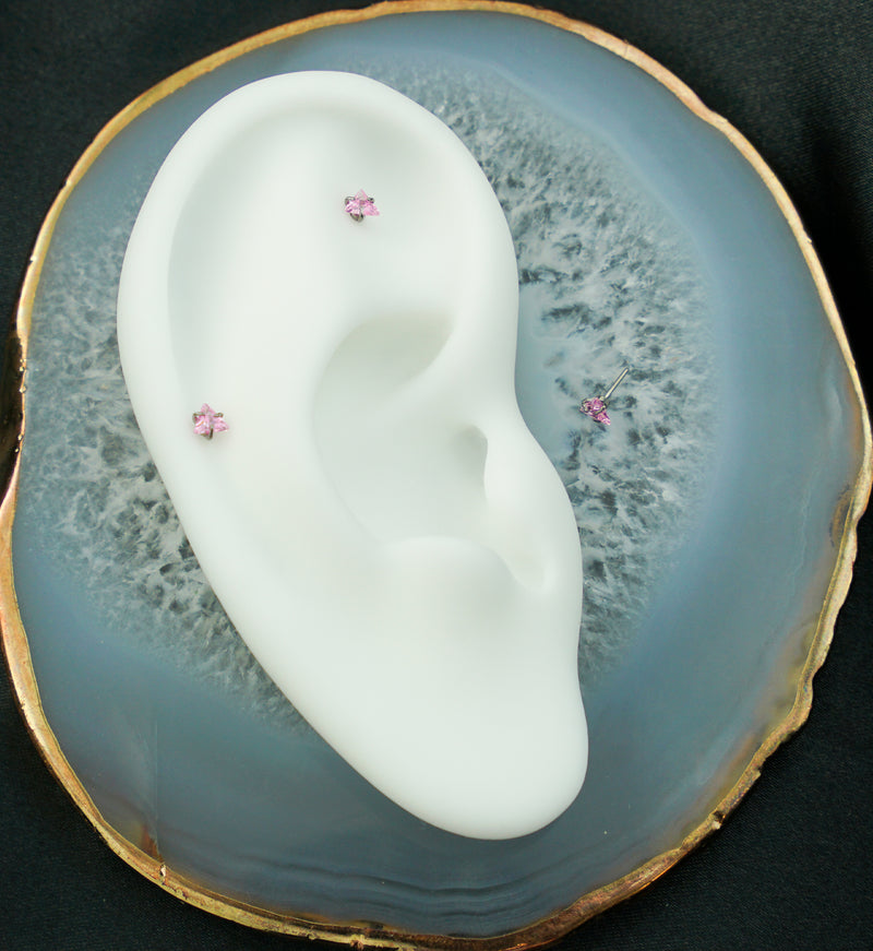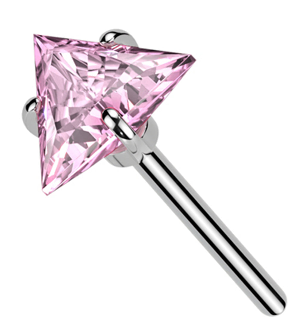 Made from durable ASTM F-136 titanium, this threadless top piece has a triangle, pink cz gem in a prong setting on top. Gem size measures 3mm. This top has a threadless design and fits most threadless posts. Sold individually.