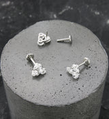 Threadless labret that consists of a trinity design that is filled with sparkling clear cz gems. Made from 316L stainless steel. Size is 18G with a 1/4" (6mm) length. 4mm flat back. Top design measures at 6mm x 6mm. Sold individually (1pc).
