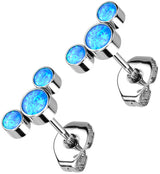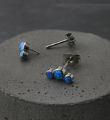 Threadless earring posts complete with butterfly backs and paired with a curved threadless top filled with three bezel set synthetic blue opal gems. Size is 20G with a 5/16" length post. 8mm top size. Constructed from ASTM F-136 titanium. Sold in pairs (2pcs).