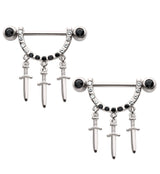 Triple Dagger Dangle Black CZ Stainless Steel Nipple Barbell