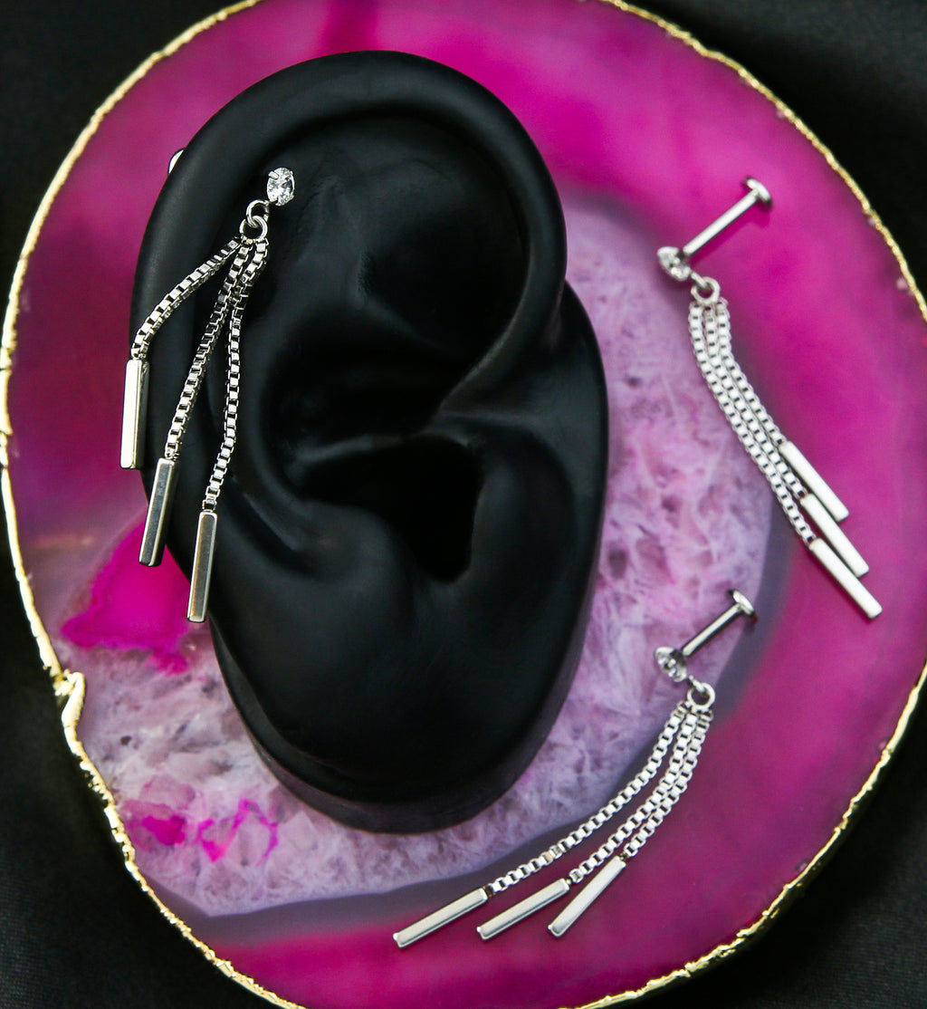 This internally threaded labret is such a fun piece to add to your collection. It features a bright clear 3mm gem and is made from 316L stainless steel. It also features 3 fun long dangles with a rectangle on the bottom. The entire design (from gem to the longest dangle) measures about 40mm x 3mm. Choose between two different size wearables: 1/4" (6mm) and 5/16" (8mm). It has a 4mm flat back. Sold individually (1pc). Intended for healed piercings.