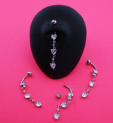 This belly button ring is a sparkling piece to add to your collection! Crafted with 316L stainless steel and featuring a dangling design that has alternating clear cz hearts and round clear cz gems. This piece is designed to fit healed navel piercings and measuring 14G with a 3/8” (10mm) barbell length. The top gem measures 5mm in size, the bottom design measures 35mm x 5mm.