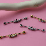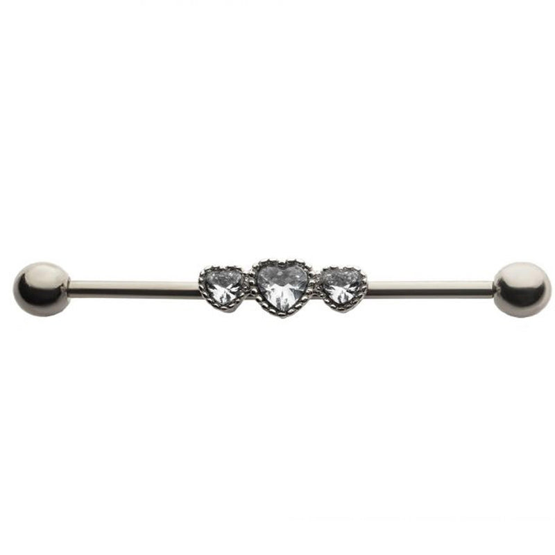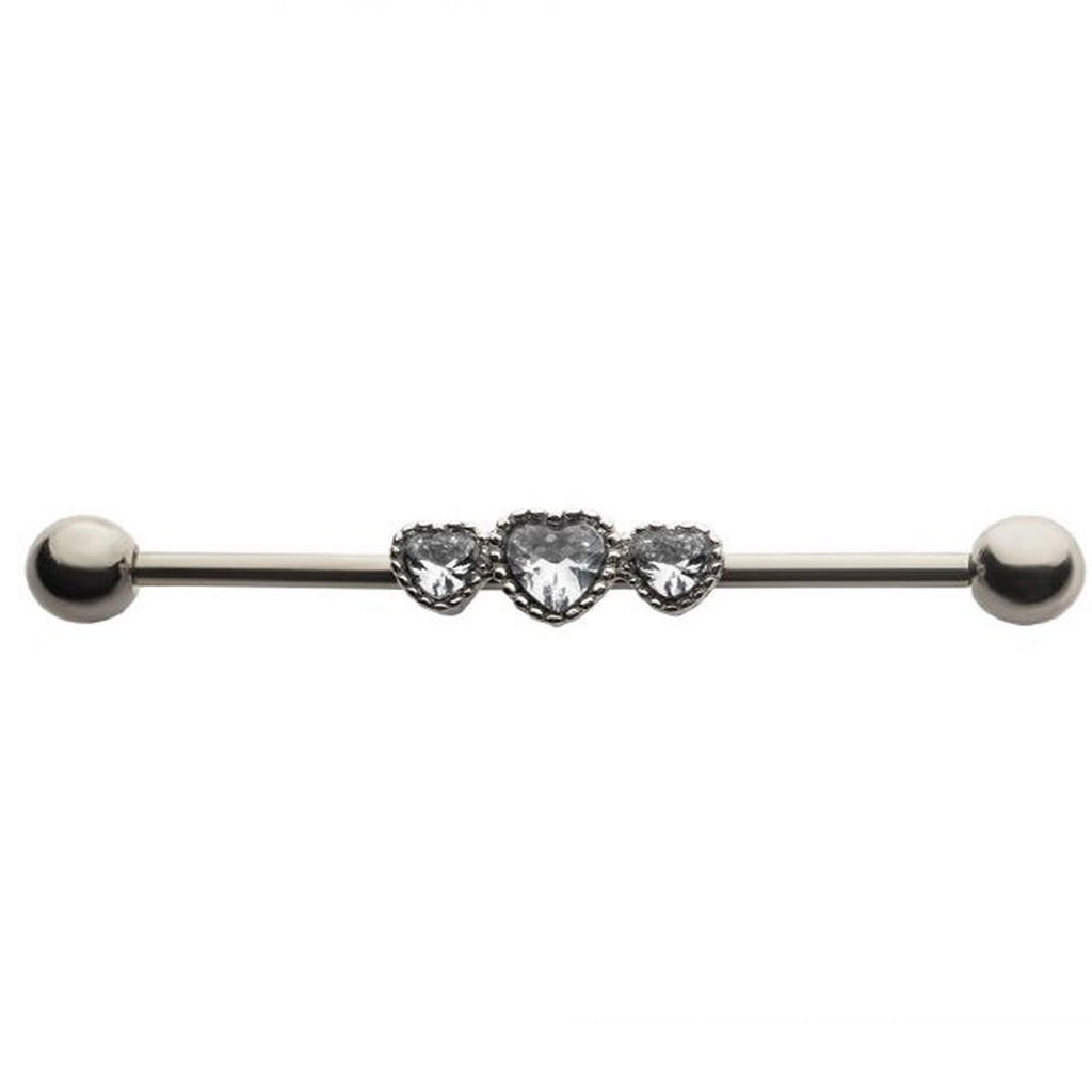 Dazzle ‘em with our silver triple heart industrial barbell! The 14g straight barbell is constructed from 316L stainless steel with 1 3/8” barbell length and 5mm balls. Easy external threading & three cubic zirconia hearts add simple shine to your look! Intended for healed piercings only.