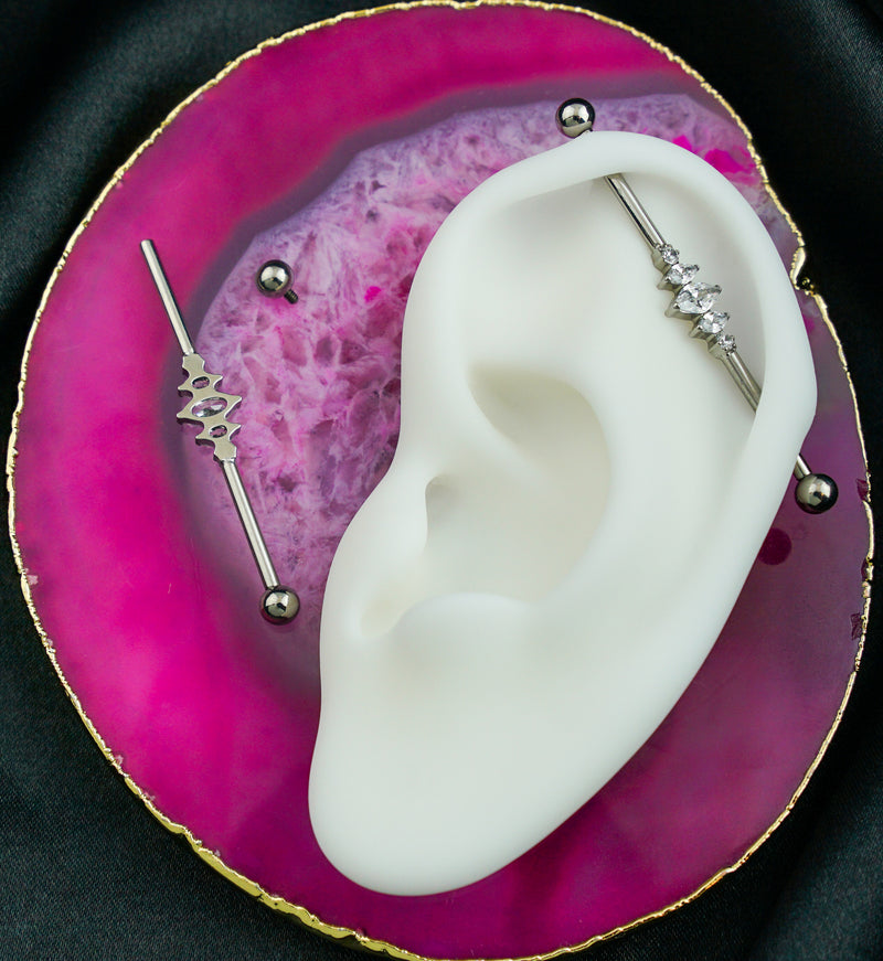 This 14g straight barbell is made from ASTM F-136 titanium with a marquise gem design in the center, consisting of three, marquise, clear cz gems and a round, clear cz gems on either side. The wearable length is 1 & ½”(38mm) and the balls ends are internally threaded and measure 4mm each. Sold individually.