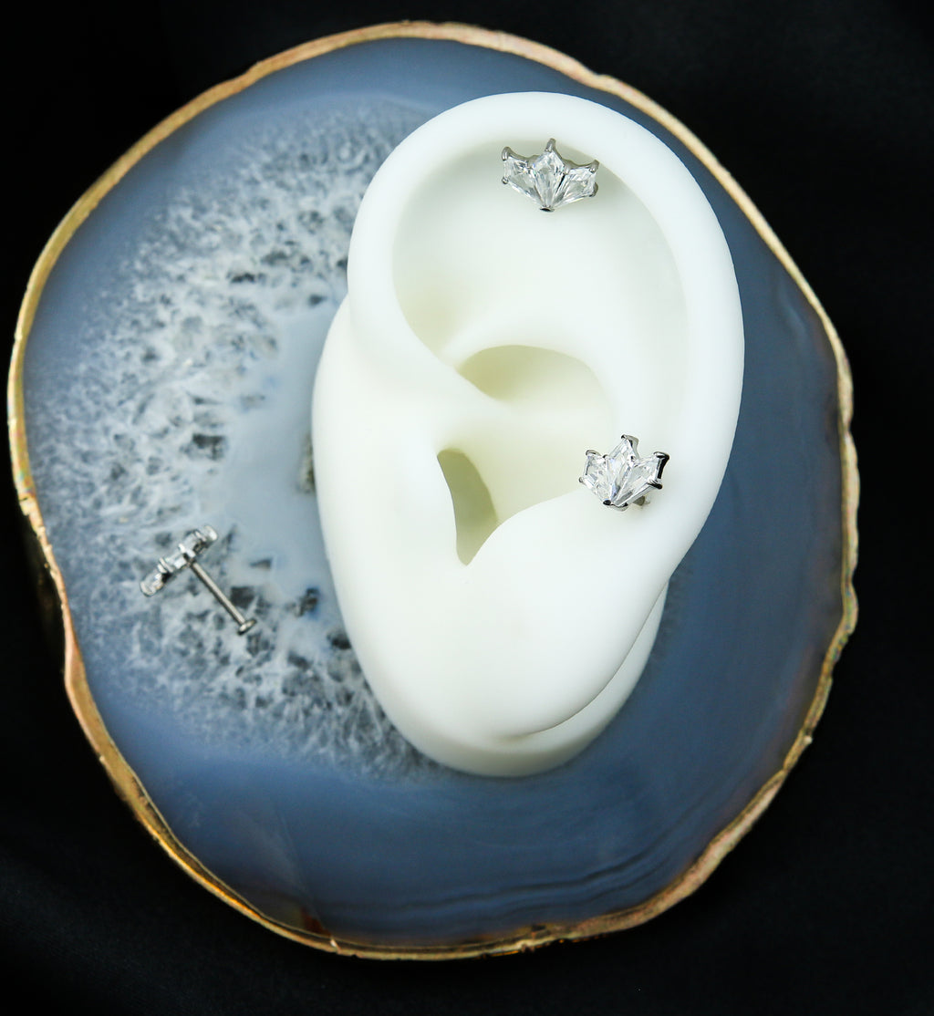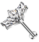 This titanium threadless labret is a sparkling choice for your cartilage or tragus piercings. It features a triple, kite-shaped, clear cz gem design along with a 25G pin and flat back disk with a 3mm diameter. Sold individually (top and bottom), it is available in size 18G with a 5/16" (8mm) wearable length.