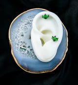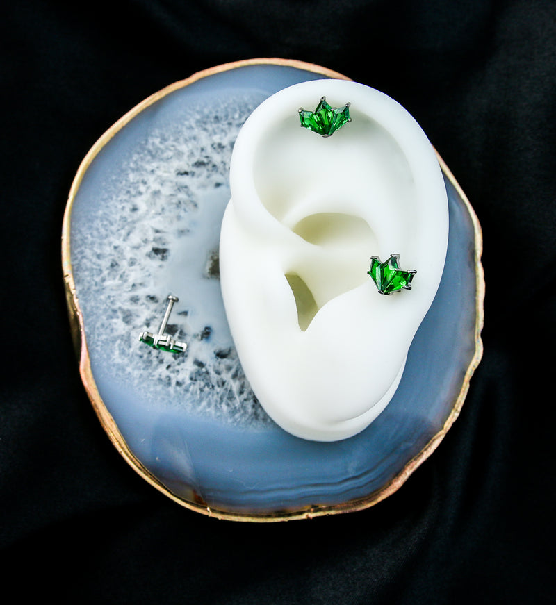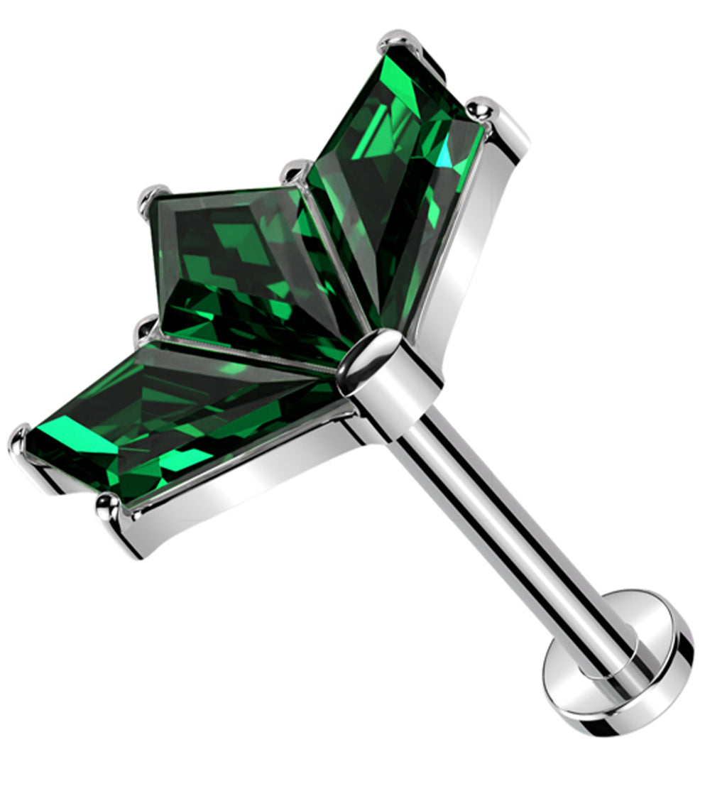 This titanium threadless labret is a shimmering jewelry option for your cartilage or tragus piercings. It has a triple, kite-shaped, green cz gem design with a 25G pin and flat back disk with a 3mm diameter. Sold individually (top and bottom), it is available in size 18G with a 5/16" (8mm) wearable length.