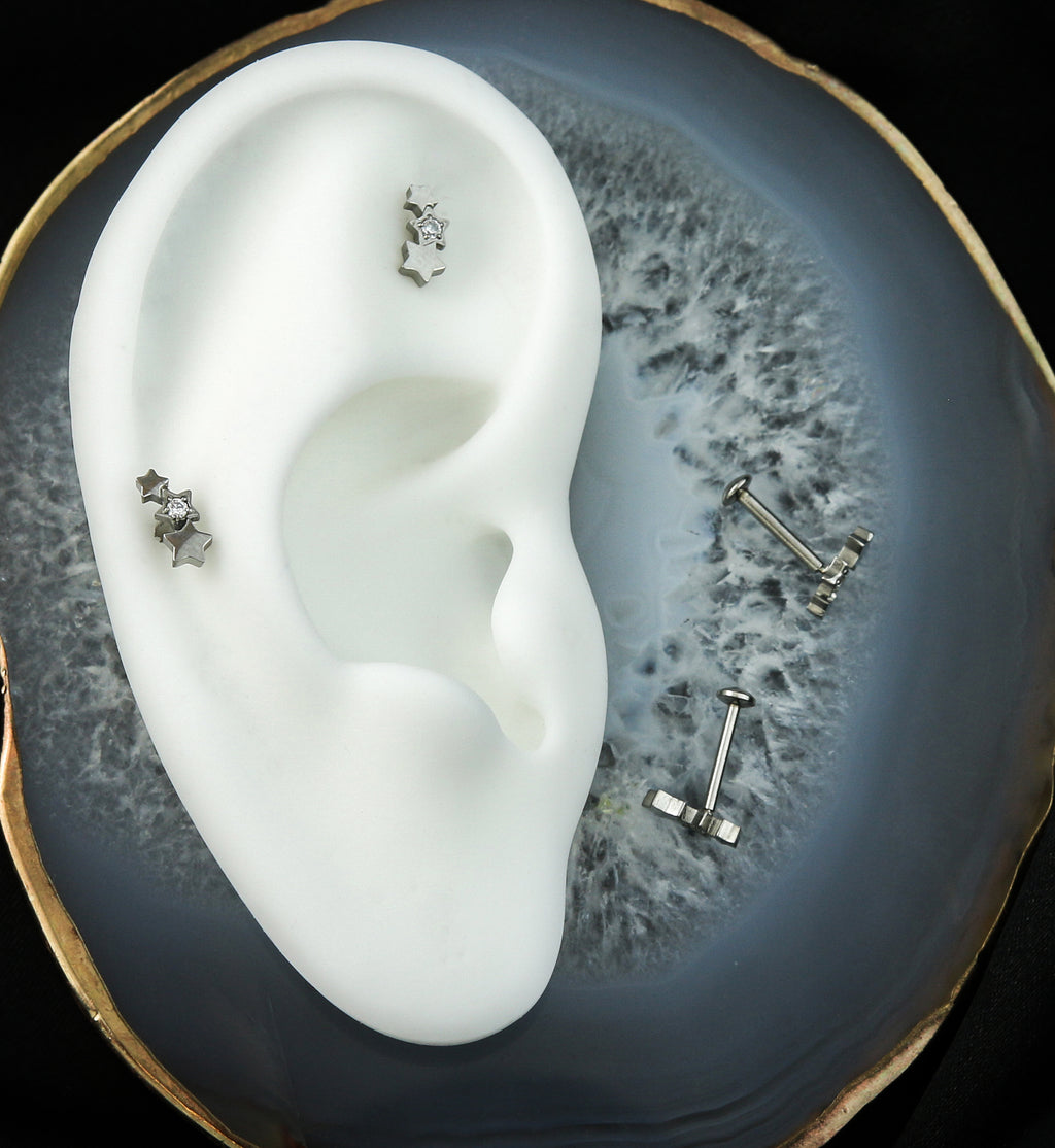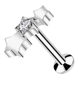 Threadless labret that features a triple star, curved design, the middle star being a clear cz gem. Made from 316L stainless steel. Choose your gauge size from 18G and 16G. The wearable area length size is 5/16" (8mm) with a 3mm convex back. Top design measures about 8mm x 4mm. Sold individually. Fun piece for your cartilage or tragus piercing!