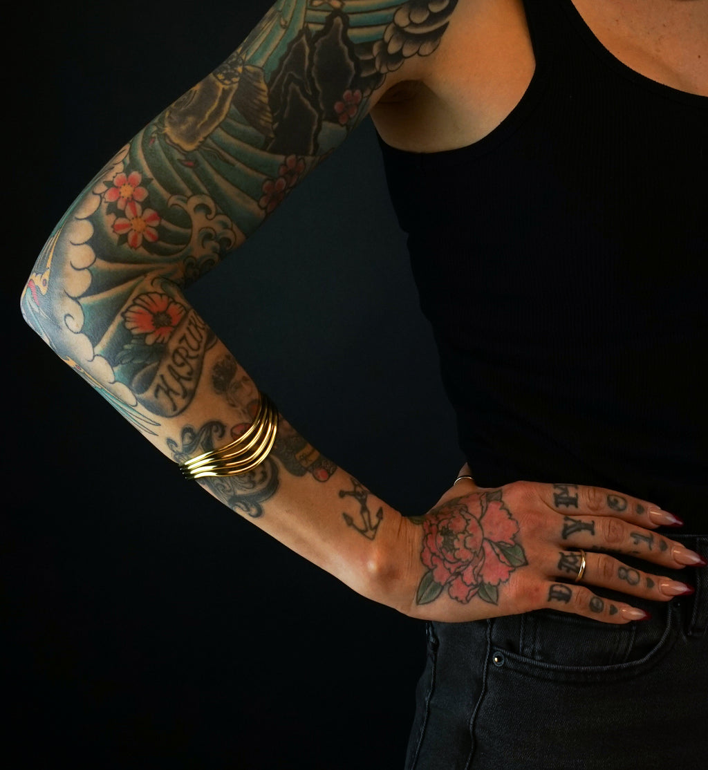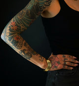 Add some flare to any outfit with our Quadruple Swerve Brass Bangle! Sold individually, this bendable bangle features a unique front design measuring 55mm in length. Made of annealed brass, it's both stylish and versatile. Wear it on your wrist or your arm! Just be mindful of extreme moisture, as it may cause oxidation.