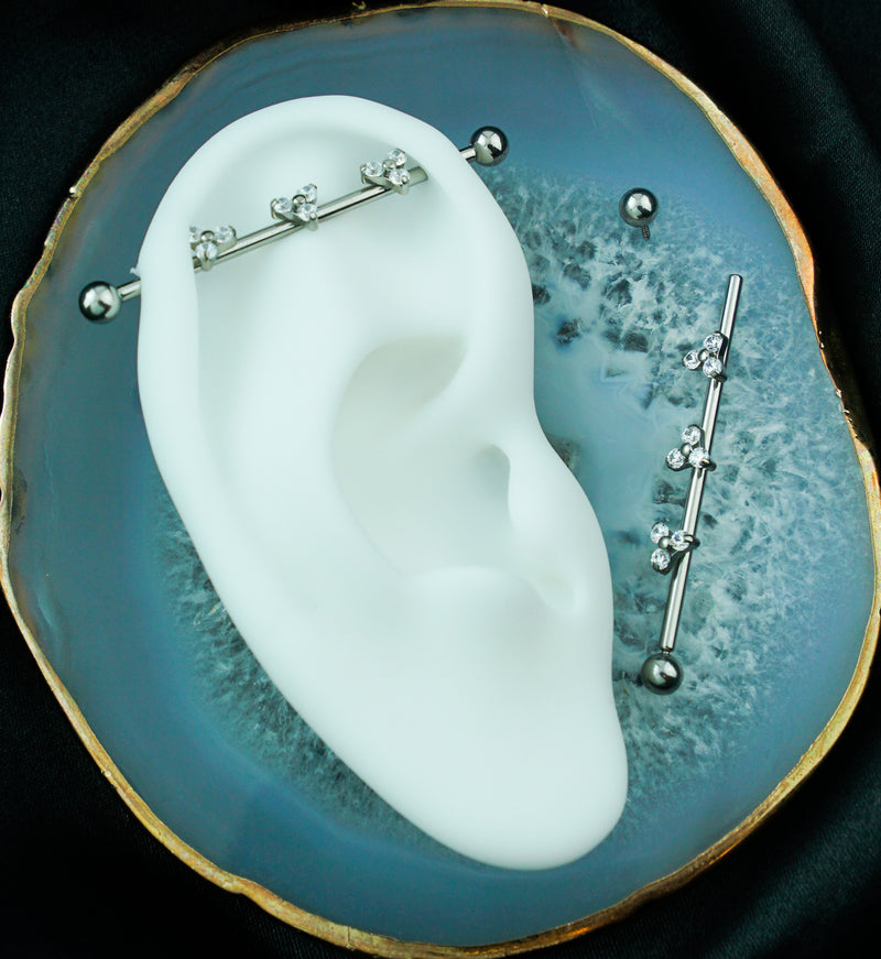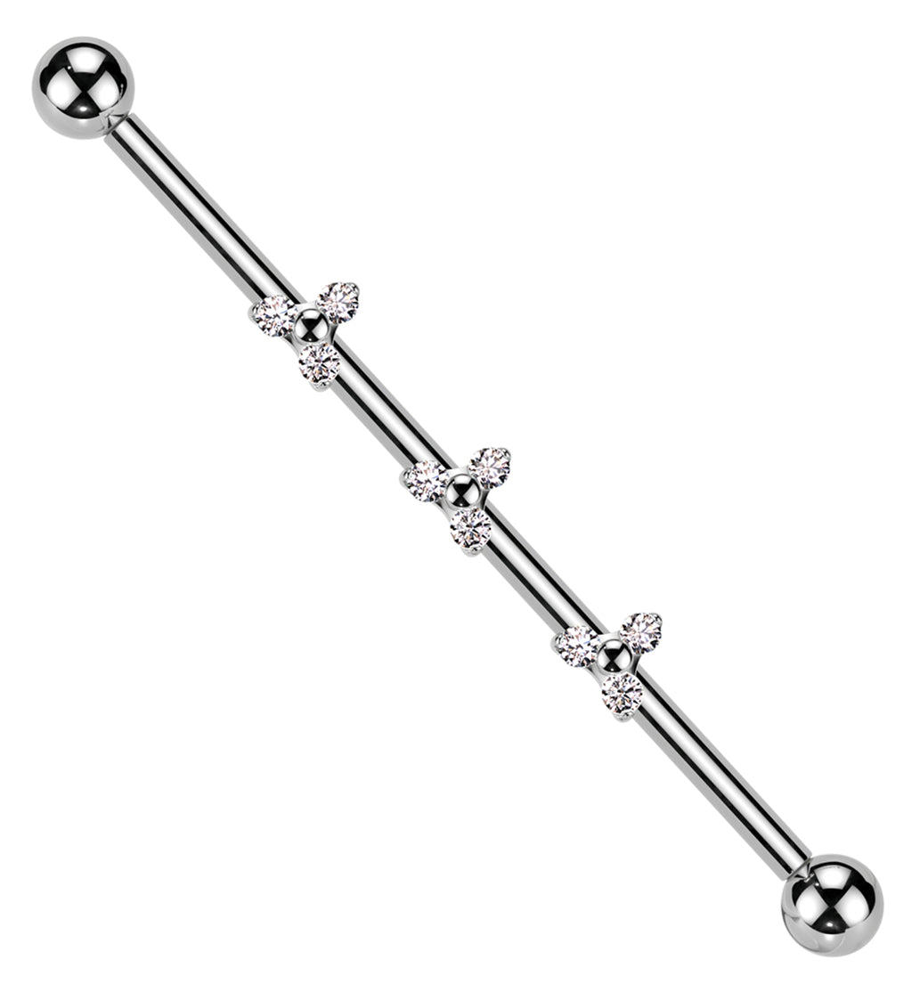 Add to your industrial piercing with this sparkling industrial barbell! The 14g straight barbell is made from ASTM F-136 titanium and measures 1 ½”(38mm) total. This barbell has a triple gem design, each cluster consisting of three, round, clear cz gems. Personalize this barbell by switching out the cz gems with your own internally threaded tops! The balls on each end are also internally threaded and measure 4mm. Sold individually.