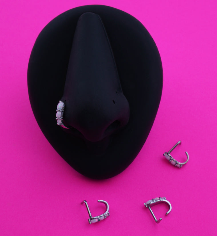 This Triple White Opalite Nose Curve is made with 316L stainless steel and synthetic white opal gems for a stunning and eye-catching look. It features a length of 5/16" (8mm) and is 18G in size. Sold individually (1 pc).