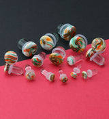 Rainbow single flare glass plugs with a hazy, swirling design consisting of orange, green, red and white amongst other colors. Pick from sizes 8G - 1/2". Can be adjusted with clear "O" rings. Wearable area is about 12mm. Sold in pairs (2pcs).