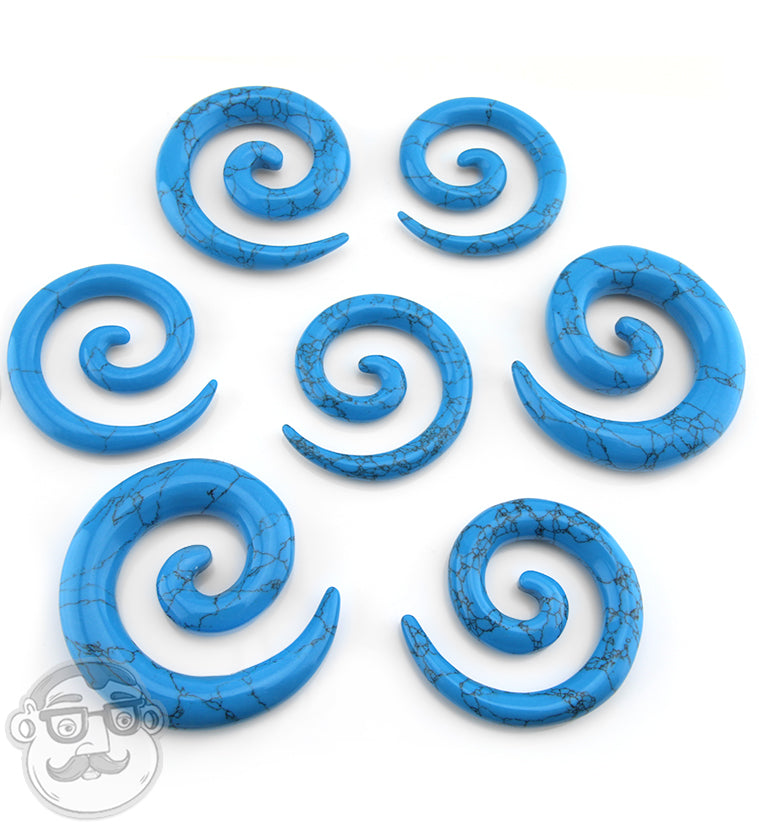 Add a splash of vibrant turquoise to your look with these handmade howlite stone spirals! Sold in pairs, each carved spiral features unique patterns and colors, making your set truly one-of-a-kind. Available in sizes 2G (6mm) to 00G (10mm), these lightweight spirals are perfect for healed lobes—just handle with care and do not use them for stretching. We’ll do our best to match you with a complementing pair.