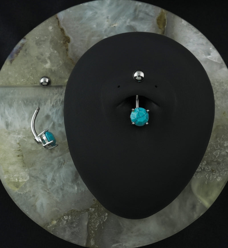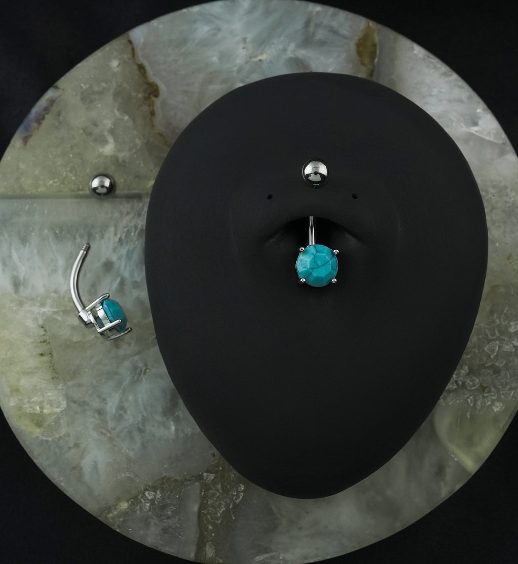 Turquoise stone belly ring set in a prong design. This simple ring is sure to be a classic in your collection as it has a pretty stone design and is an easy piece to wear. It comes in size 14G with a 3/8" (10mm) wearable length. The barbell is made from 316L stainless steel and is externally threaded.