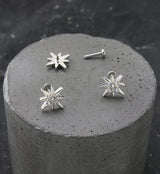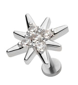 Internally threaded labret that consists of a starburst shaped top that is filled with clear cz gems. Size: 18G. Length is 1/4" (6mm) with a 3mm flat back. Made from 316L stainless steel. Sold individually (1 pc).