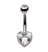 Sparkling belly button ring with a heart shaped cz gem that has a twist accent along the outside. Size is 14G with a 7/16" 11mm barbell. It is made from 316L stainless steel. Externally threaded. Top clear cz measures at about 5mm. Bottom heart cz is about 9mm x 9mm. Sold individually (1 pc).