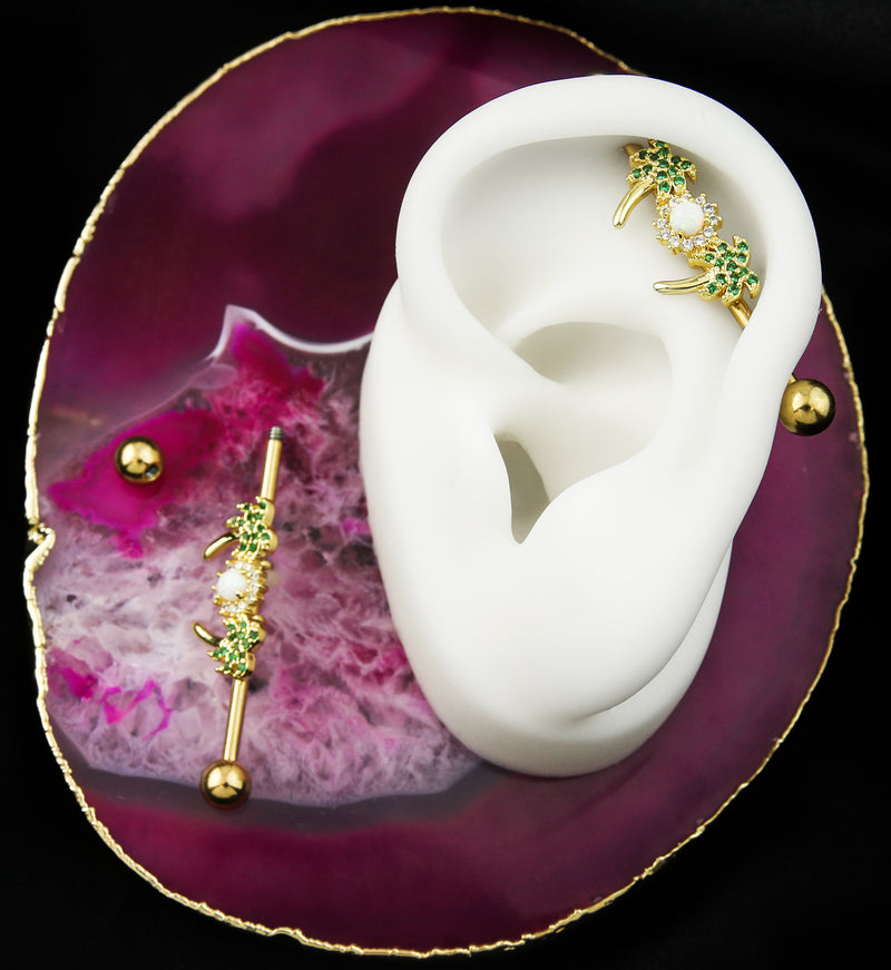 This Two Palm Industrial Barbell gives off the perfect hint of summer right at your finger tips. It is made with gold pvd on 316L stainless steel. The two palm trees feature green cz gems. The sun features a synthetic white opalite, surrounded with clear cz gems. Design measures about 18mm x 10mm. The barbell length of 1-1/4" (32mm). 5mm externally threaded balls. For healed piercings. Sold as a set (3 barbell lengths included).