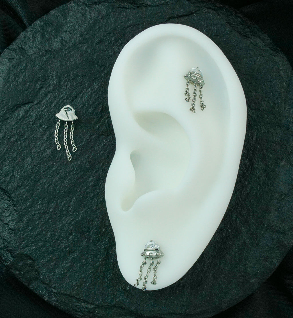 Adorable threadless top piece that is out of this world! It is made with ASTM F-136 titanium and features a mini UFO shape that is accented with clear cz gems and has attached, dangling chains. This top measures 18mm x 6.5mm which includes the chain length. Plus, this piece fits most threadless posts. Great for a variety of piercings, sold individually.