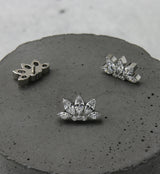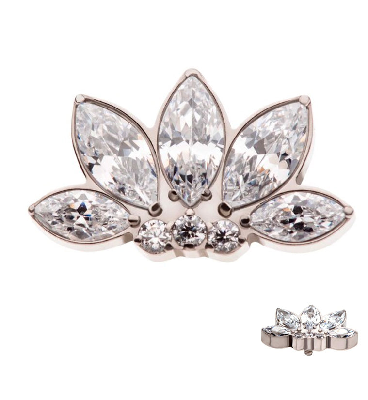 Sparkling internally threaded top piece that has a fan-shaped design filled with several clear marquise and round cubic zirconia gems. Made from ASTM F-136 titanium. Measures about 10mm x 5.8mm. M0.9 threading. Sold individually (top piece only).